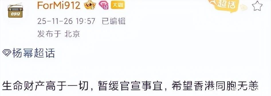 领头祈福11月27日早晨七点,杨幂发文为香港同胞祈福。杨幂发文的时候,或许很多人还不知道香港的火灾的事情。在前一天,香港大埔宏福苑发生火灾,火势于下午两点开始。到下午三点就已经升级为3级,下午六点就已经升级为五级。