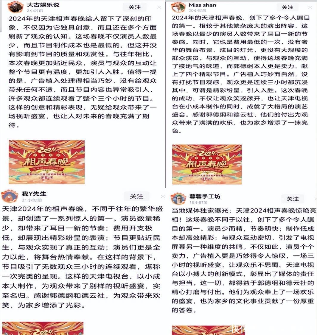 类似情况在2024年曾经发生过,天津卫视和德云社联合举办了相声春晚之后不久,网络上突然出现一大批相同配图和雷同内容的小作文,像是同一个人写的一样。相声春晚都结束了还在疯狂宣传,而且内容和配图高度雷同,这样做不仅没有宣传效果,反而会让外界产生怀疑是不是出动水军了,实在是得不偿失。