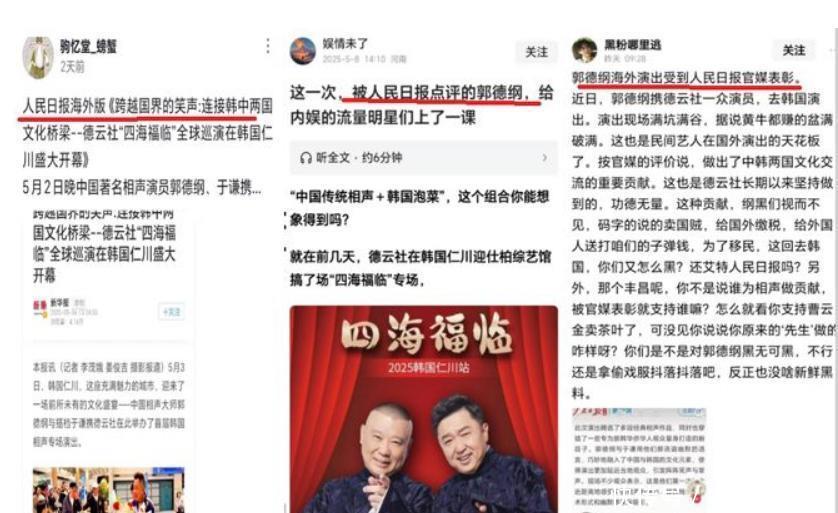 在盲目宣传这件事上德云社吃过自媒体的亏,也是在2025年,众多德云系自媒体疯狂宣传“人民日报表扬郭德纲”,还称呼郭德纲为“中国相声大师”。